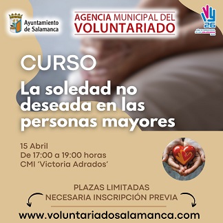 Curso destinado a adquirir conocimientos y estrategias sobre la ‘soledad no deseada’. OBJETIVOS: Sensibilizar y formar a las personas participantes sobre la realidad de la soledad no deseada en las personas mayores. Proporcionar herramientas básicas para su detección y abordaje desde el ámbito social y comunitario. /-\ CONTENIDOS: La soledad en las personas mayores. Qué es la soledad no deseada. Detección y señales de alerta. Estrategias de intervención y acompañamiento. /-\ PLAZAS LIMITADAS. NECESARIA INSCRIPCIÓN PREVIA.