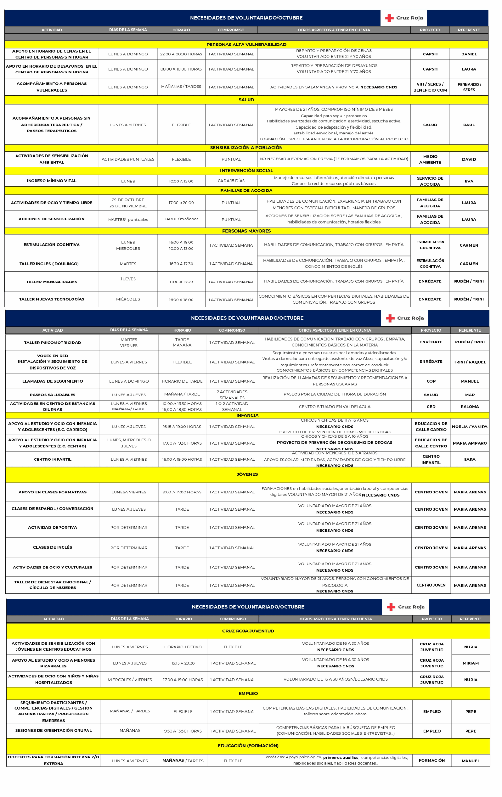 Se trata de diferentes actividades de varios ámbitos de intervención dentro de la propia entidad: *Salud *Personas alta vulnerabilidad *Sensibilización a población *Intervención social *Familias de acogida *Personas mayores *Juventud *Empleo *Educación/Formación